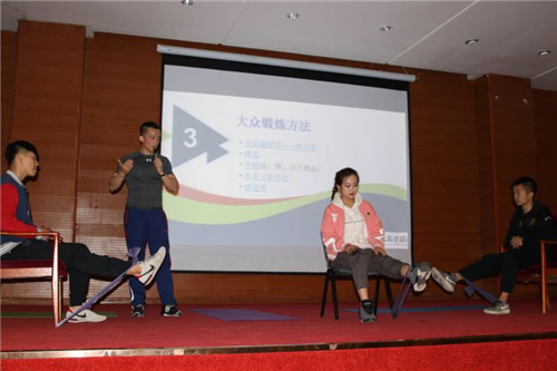 在講座中,王維老師從腿部力量測試;下肢構造;鍛煉方法;特殊人群X、O、XO形腿;中醫腿部保健;營養配餐+運動人生等六個方面,系統地介紹了鍛煉和提高腿部力量的方法及途徑,通過科學的鍛煉方法,達到提高和增強身體素質的目的,為同學們掌握科學有效的健身鍛煉方法提供理論依據。并針對運動后恢復、拉伸,特別是針對特殊的腿型等等問題,給出了科學有效的修正方法。王維老師還通過與學生的現場實踐、演示及互動,幫助同學們學會掌握幾種增強腿部力量的訓練方法。這些方法簡單易學,不僅適合在校學生,而且還適合沒有時間參與體育運動、健身鍛煉的白領們。
