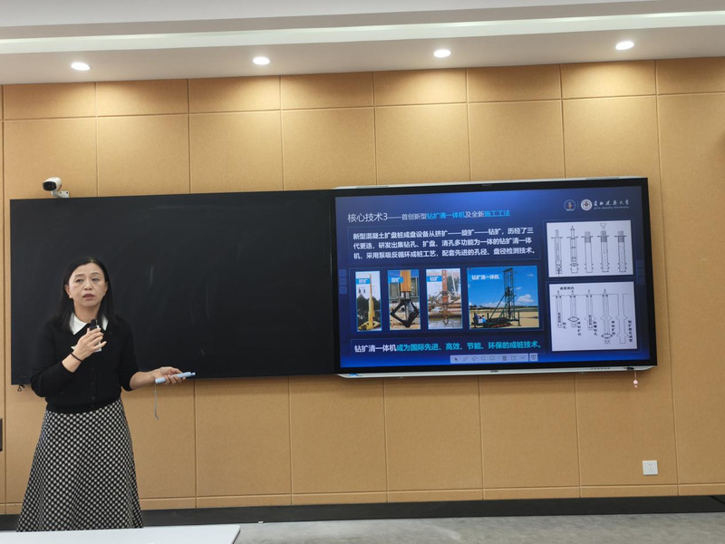 錢永梅教授以科研育人新范式開篇,著重強調科研能力培養前移的重要性,指出本科生群體正在成為科研創新的新興力量。她結合自身團隊的創新實踐,系統闡釋了新型混凝土擴盤樁技術的研發脈絡:從樁型演變史切入,詳細解析該技術在施工工藝革新、力學性能優化等方面的突破;通過圖文并茂的演示和詳實的數據對比,系統闡釋了該技術從理論研究到工程應用的完整創新鏈條。特別針對兩項核心技術——“新型半面樁多工況全程可視化試驗方法”與“創新滑移線理論智能化成套設計計算平臺”,錢教授通過實驗室模擬視頻與工程實例分析,生動展現了科研成果轉化生產力的具體路徑。錢教授結合工程案例,對復雜地質條件下的樁基設計優化、施工參數控制等難點問題進行了深入剖析,為現場師生提供了極具參考價值的技術解決方案。報告會結束后,錢教授和與會師生進行了學術交流,耐心細致的回答了師生提出的問題,并在科研項目申報的選題、工程實踐中出現的問題等方面給予了指導和幫助,師生們紛紛表示受益匪淺。