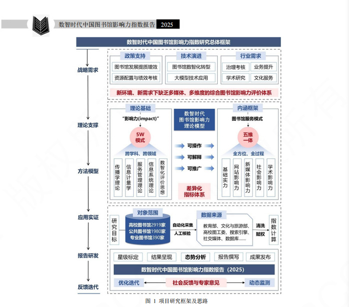 此研究是承接《中國圖書館網絡影響力評價報告(2023-2024)》和《數智時代中國圖書館影響力評價報告(2024)》開展的第三次全國圖書館影響力研究,遵循“戰略需求—理論支撐—方法模型—應用實證—報告研發—反饋迭代”的思路展開。戰略需求側重梳理文化強國、科教興國等國家戰略要求,以及開放科學與新型網絡環境帶來的現實需求;理論支撐圍繞國內外相關研究現狀,梳理影響力的分類標準、測度原則與評價導向;方法模型聚焦數智技術驅動下的指標體系與分析模型構建;應用實證是指依托“資源—技術”優勢,對國內圖書館開展分類、多維的影響力實證分析;報告研發聚焦指數報告的撰寫與發布,為學界、業界、館界以及管理部門提供參考依據。